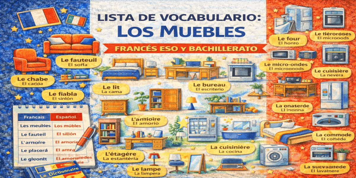 Este material es una lista de vocabulario sobre los muebles en francés diseñada para ampliar y consolidar el léxico básico en la asignatura de Francés en ESO y Bachillerato. Se trata de un recurso estructurado y claro que permite trabajar el vocabulario relacionado con el mobiliario del hogar y los electrodomésticos, fundamental para describir espacios …